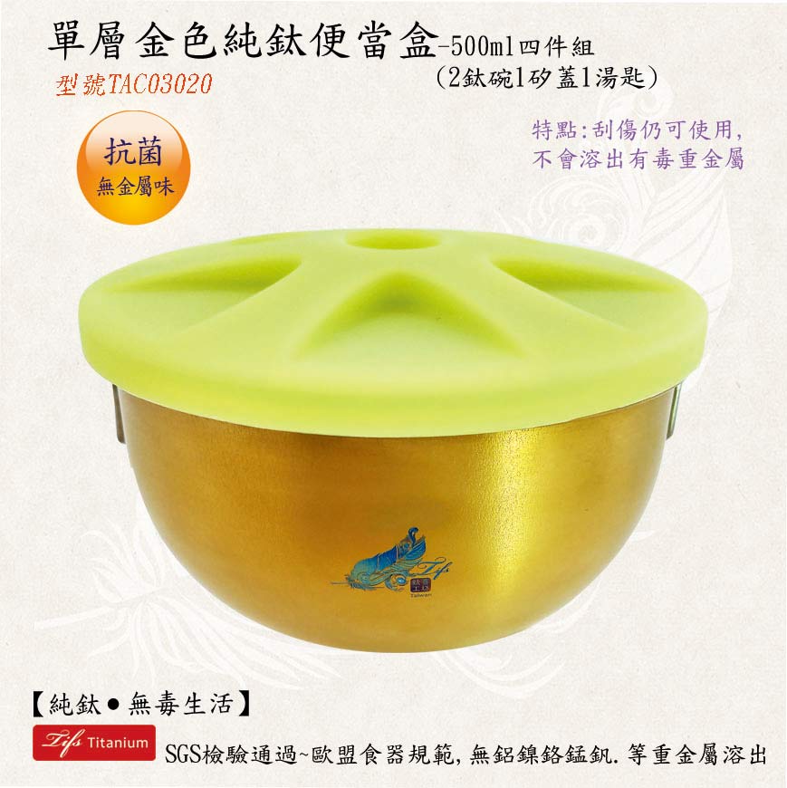 Tifs Titanium500ml四件組-單層金色純鈦碗鍋具組(2碗1蓋1匙)